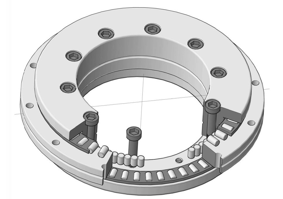It consists of a thrust centripetal seat ring, a thrust centripetal shaft ring, a thrust washer, two needle roller cage assemblies and a set of centripetal cylindrical rollers. The seat and ring have evenly spaced screw holes for mounting. These bearings have high axial and radial load capacity. High tilting stiffness and extreme precision. Suitable for bearing arrangements in rotary tables, chucks and iron cutter heads, as well as in measurements and experiments. This type of bearing also has high requirements for the matching equipment parts. The tightening torque of the mounting screws should be controlled during installation.